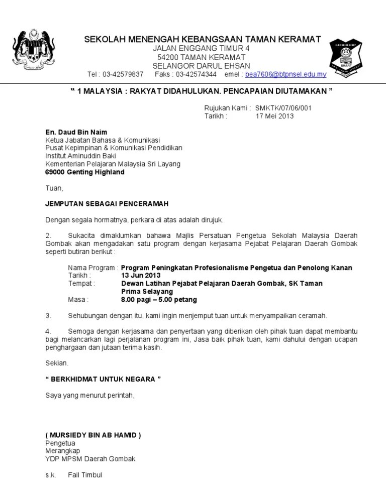 Meskipun begitu surat formal tidak harus selalu dibuat oleh keluarga, bisa jg dibuat oleh individu. Kami kongsikan panduan menulis dan contoh surat rasmi dengan format yang betul. 28.11.2015 · pada kesempatan kali ini saya akan membagikan 68 contoh undangan tasyakuran format word gratis terbaik pada anda yang tentunya saya bagikan secara gratis, contoh undangan tasyakuran format word merupakan rangkuman dari beberapa contoh undangan tasyakuran format word yang ada saat ini, untuk mendownload contoh contoh undangan tasyakuran format word anda cukup klik … Kini, guru tersepit dalam menghadapi karenah pelajar bermasalah yang datang darpada pelbagai latar belakang dan corak … Surat rasmi sangat penting untuk urusan bersifat rasmi dan formal. Bantahan, surat perakuan, surat jemputan, surat cadangan dan sebagainya. Selain itu, memo merupakan satu bentuk penulisan yang ringkas, padat tetapi jelas. 09.10.2014 · peluang sir andrew terbentang luas apabila raja abdullah menulis surat meminta bantuan british untuk. Sebagai organisasi formal, sekolah mempunyai struktur kepimpinannya sendiri. Foto daripada siaran pertubuhan keselamatan sosial bersempena dengan sambutan jubli emas penubuhannya, perkeso telah melancarkan syiling peringatan, setem, lembaran mini dan sampul surat peringatan perkeso. Majlis anugerah pelajar cemerlang aturcara majlis 8.30 pagi : Ketibaan para jemputan 8.50 pagi : Ketibaan yang berbahagia datuk ali bin abu, pengarah bahagian pendidikan guru, jabatan pendidikan wilayah persekutuan 9.00 pagi :